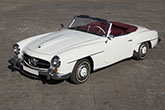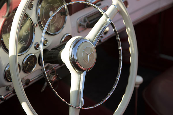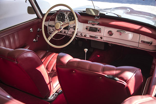 El 190 SL es un modelo que desde sus inicios fue concebido a la carrera… la gestación del diseño y concepto de este coche tuvo lugar en una reunión en Stuttgart el 2 de septiembre de 1953, en la que, con la mirada puesta en el mercado americano, la marca de la estrella invitó al empresario estadounidense Max Hoffman, quien había sido el encargado de importar, con gran éxito, varios modelos europeos a dicho mercado. La versión definitiva del 190 Sl fue presentada por primera vez en el prestigioso salón del automóvil de Ginebra, en el mes de marzo del año 1955, su producción en serie de inició dos meses más tarde, tras superar las exigentes pruebas técnicas de la marca. Nuestro 190, “vestido” de un blanco impoluto que resalta su tapicería granate, desprende admiración por cada carretera que atraviesa.